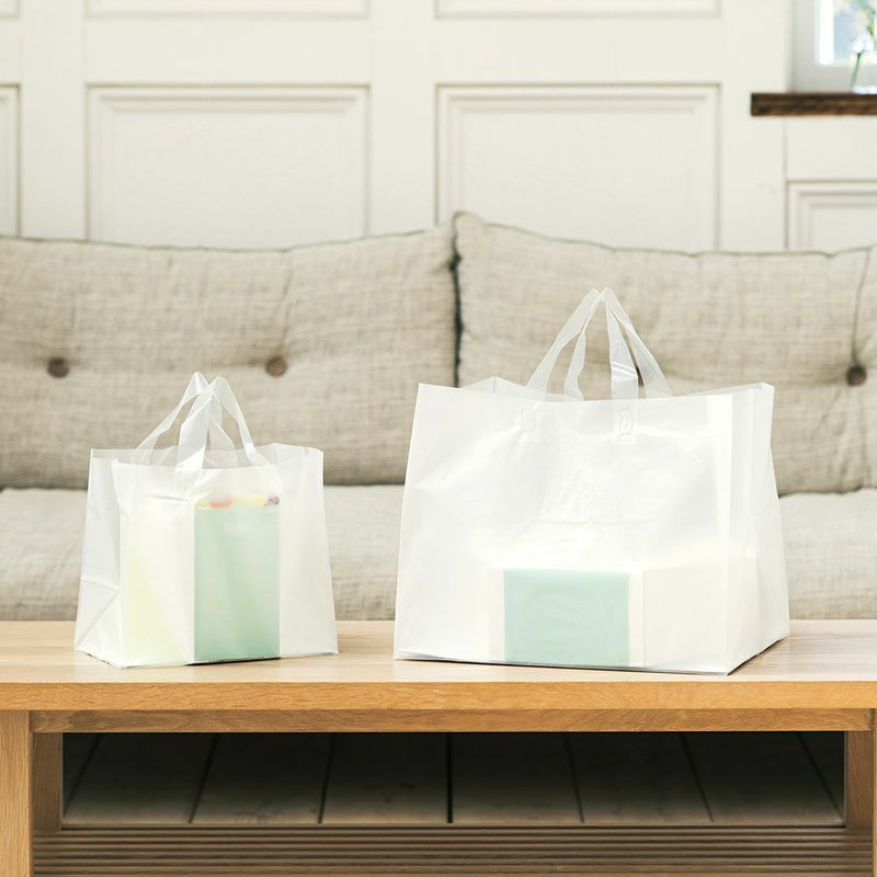 1段ボックスのありがとうギフト、おめでとうギフトに適正サイズのコンパクトな半透明の手提げ袋です。