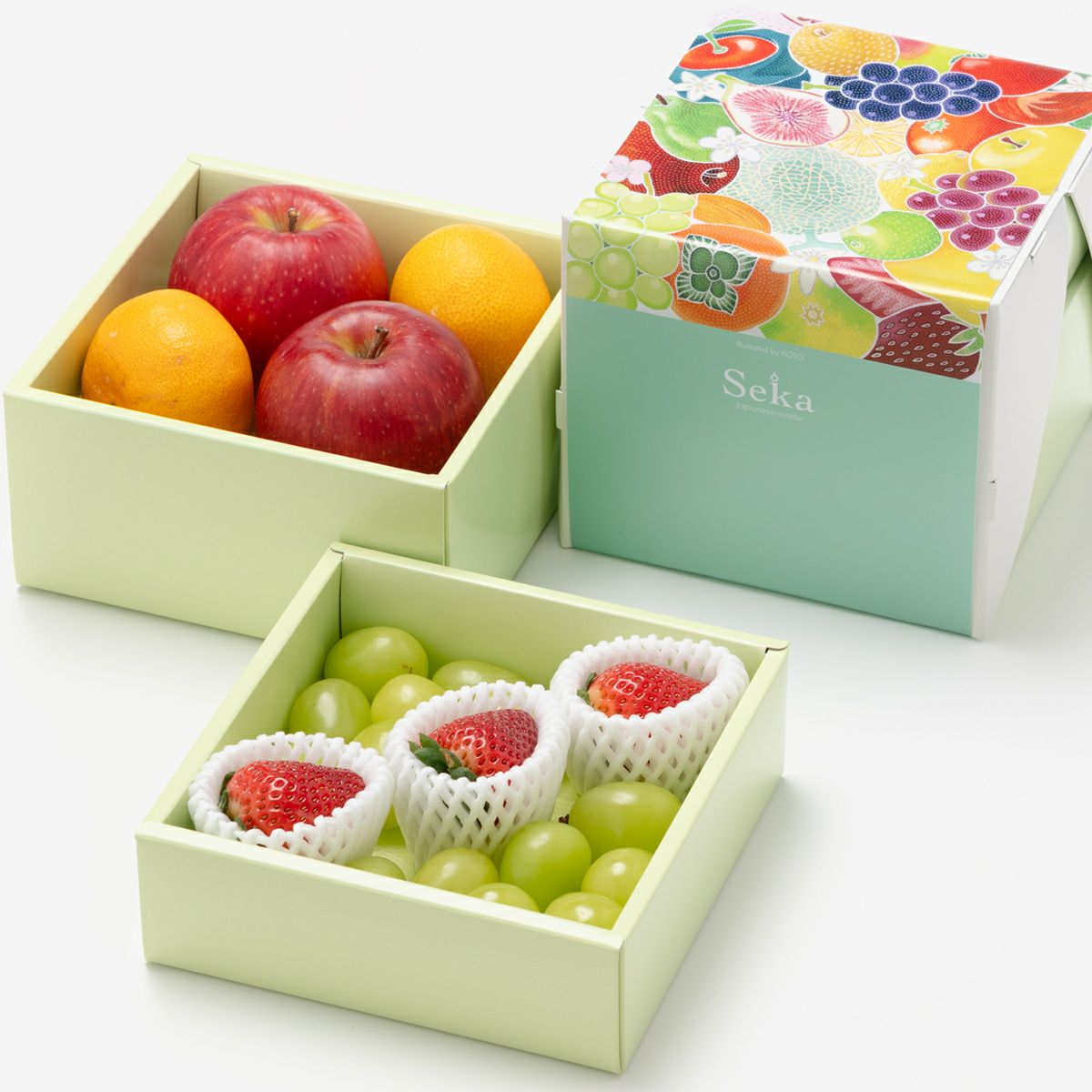 溢れんばかりのフルーツな包装紙を身にまとい、白とSeikaカラーのきみどり色のバイカラーの箱を開けると、まさにフルーツの宝石箱。
