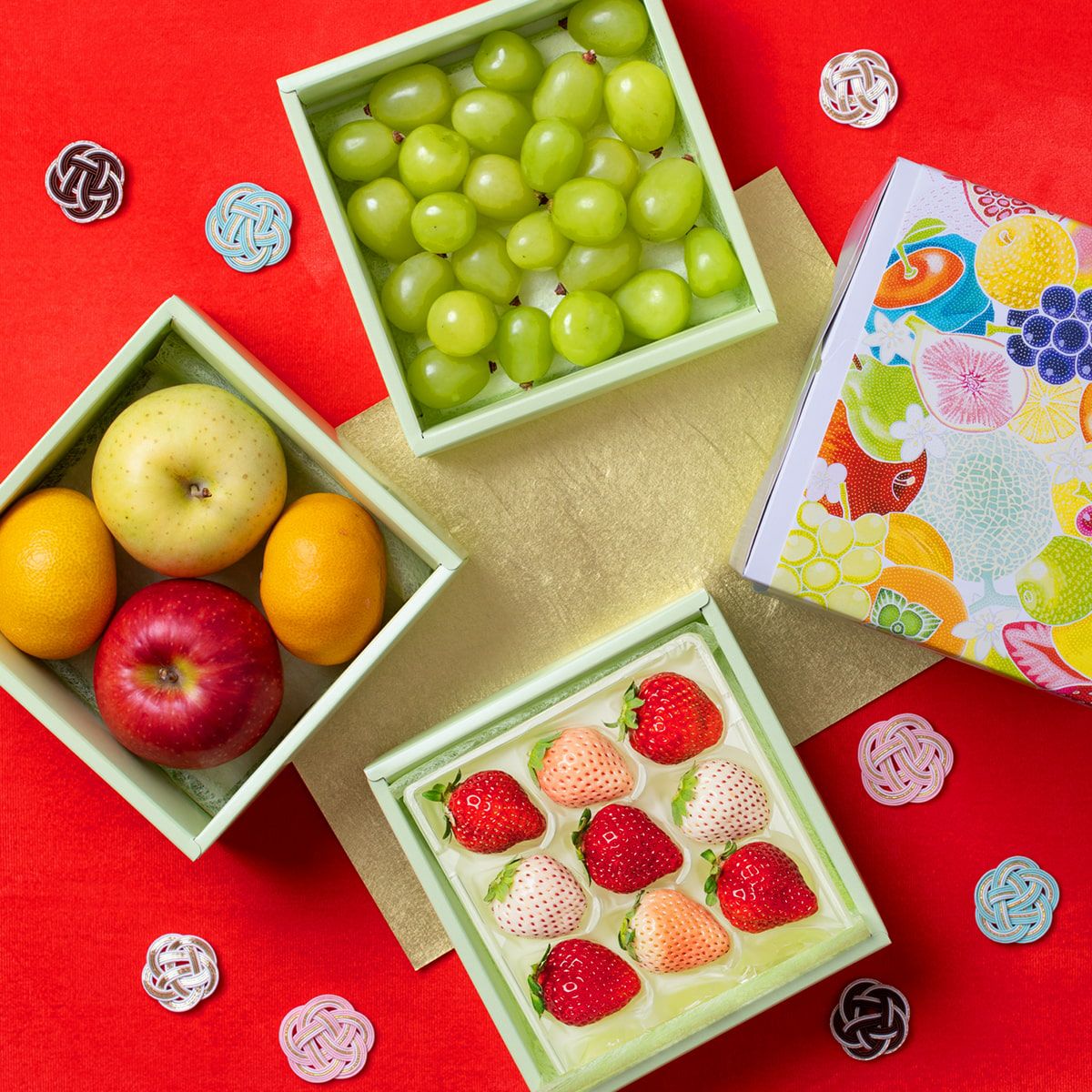 開けた時に最初に目に入る1段目には、おめでたくて珍しい紅白いちごを、 2段目には、皆で食べやすく海外でも人気の高い高級蔵出しシャインマスカットを、 3段目には、来客の方のお土産にできたり、ゆっくり楽しめる 紅白のリンゴとみかん、人気の高級柑橘紅まどんなを詰めました。