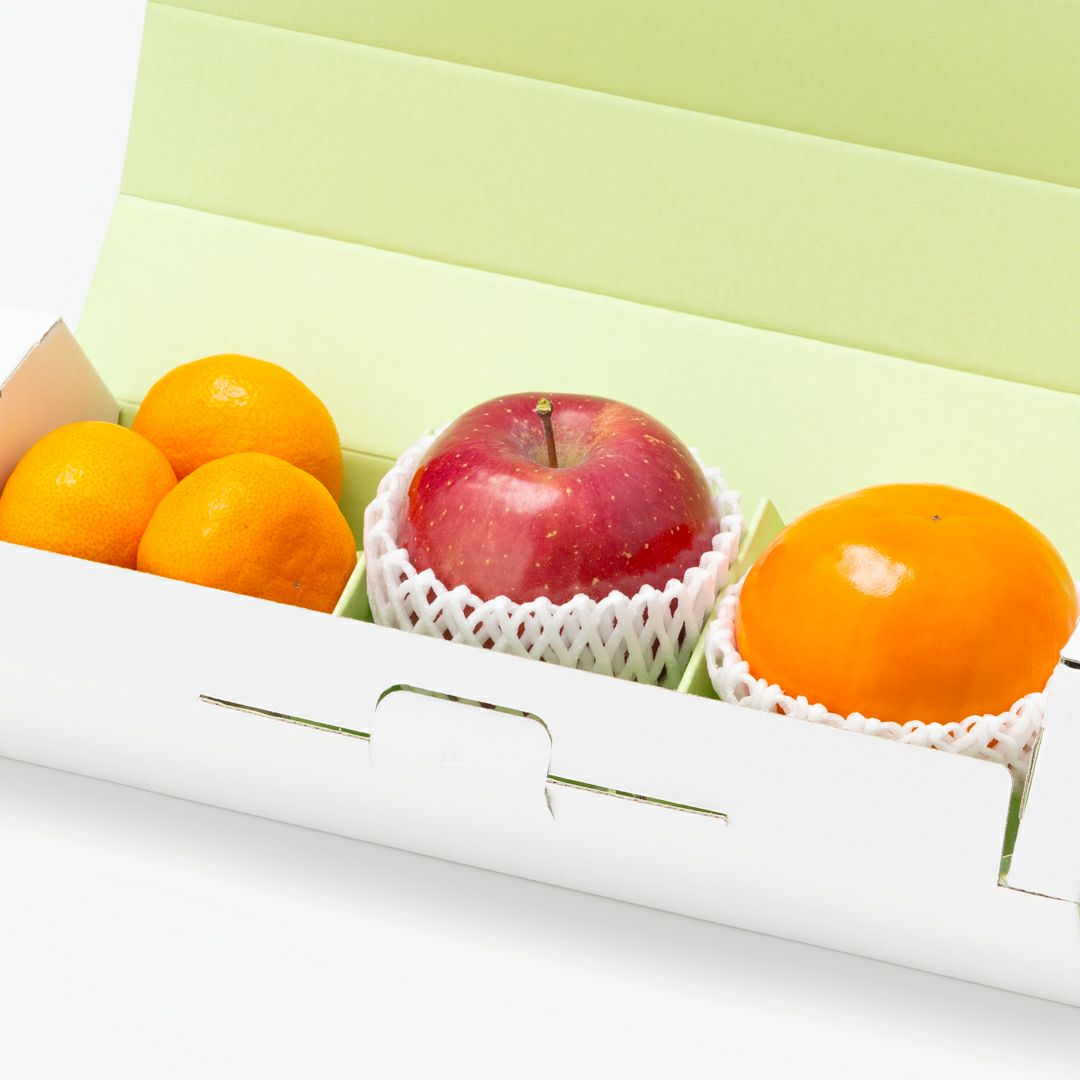 全国各地から厳選したみかんと柿、色鮮やかなりんごをセットにしました。
