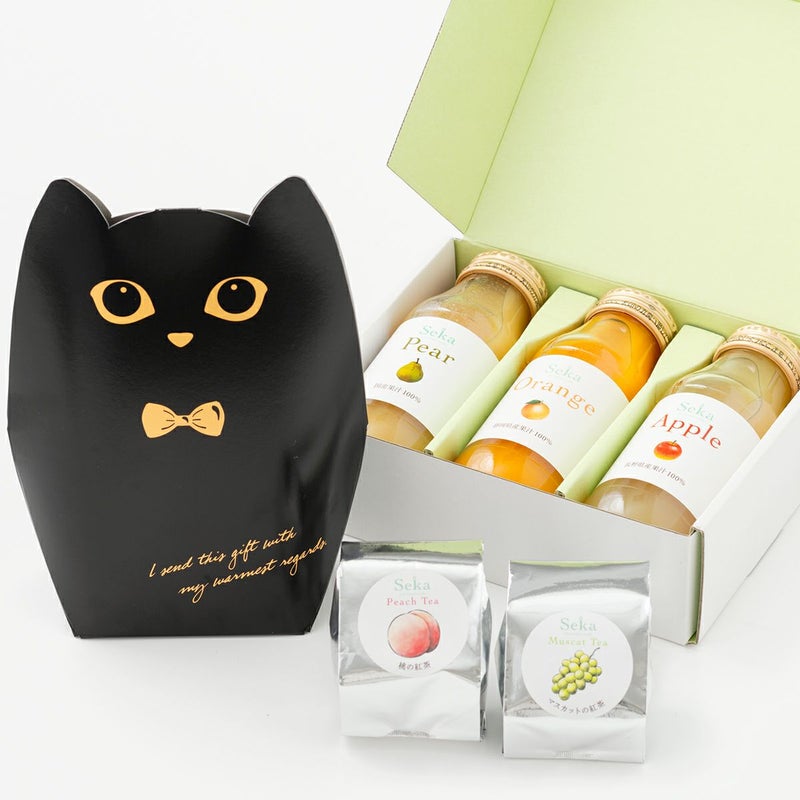 まるでフルーツをそのまま飲んでいるかのような濃厚な国産ストレート果汁100%のジュース3種類と、かわいい黒猫のパッケージが印象的な、香り豊かで美味しいフルーツティー2種のギフトセットは、自分へのご褒美にも最適。