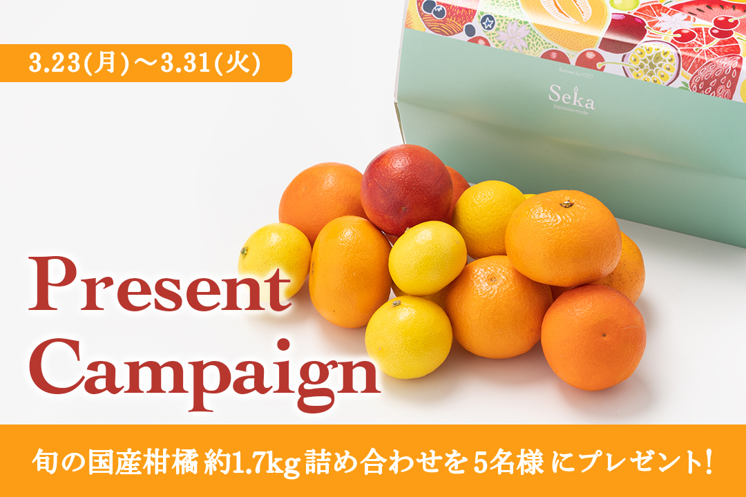 Seika フルーツギフト店では、3月24日(火)〜31日(火)の期間中、厳選した旬の国産柑橘を5種類詰め合わせた【旬の国産柑橘のミステリーボックス】が、抽選で5名様に当たるキャンペーンを開催します。